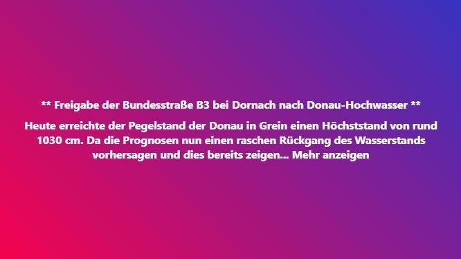 Da momentan ein Übertreten der Donau über die B3 vorhersehbar ist, gilt ein allgemeines Fahrverbot von Höhe Saxen bis zur Donaubrücke. Wir appellieren an alle, dieses Verbot zur eigenen Sicherheit einzuhalten.