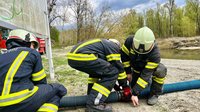 Die Wasserentnahme aus der Donau stellte durch den niedrigen Wasserstand und den starken Höhenunterschied eine besondere Herausforderung dar. Verschiedene Löschtaktiken wurden erprobt.