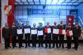 Ein besonderer Programmpunkt waren die Ehrungen und Auszeichnungen verdienter Kameradinnen, Kameraden sowie unterstützender Unternehmen. Die Firma SCHLAGER Transport Logistik GmbH wurde dabei für besondere Verdienste um das Feuerwehrwesen ausgezeichnet. Dass die Veranstaltung auf dem Firmengelände stattfand, passte hervorragend zum Veranstaltungsmotto, denn bei SCHLAGER ist „Innovation gelebte Tradition“. Bereits im Vorfeld erhielten die Feuerwehrkameradinnen und Feuerwehrkameraden interessante Einblicke in den vollelektrischen LKW-Fuhrpark des Unternehmens sowie in die dazugehörige Ladeinfrastruktur. Diese zukunftsweisenden Entwicklungen zeigten eindrucksvoll, wie Innovation in der Praxis umgesetzt wird.